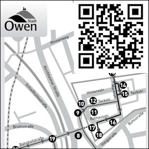 Des Weiteren wurden die Tafeln des Historischen Stadtrundgangs Owen inhaltlich überarbeitet, die angebrachten QR-Codes hinter Glas angebracht. Ergänzende Hintergrundinformationen zu den Tafeln sind über einen auf der Homepage hinterlegten Code mit dem Smartphone jetzt abrufbar. Der Vorschlag aus der Versammlungsmitte, Ergänzung des Rundgangs mit sogenannten „Lauschecken“, soll in Zukunft noch umgesetzt werden.