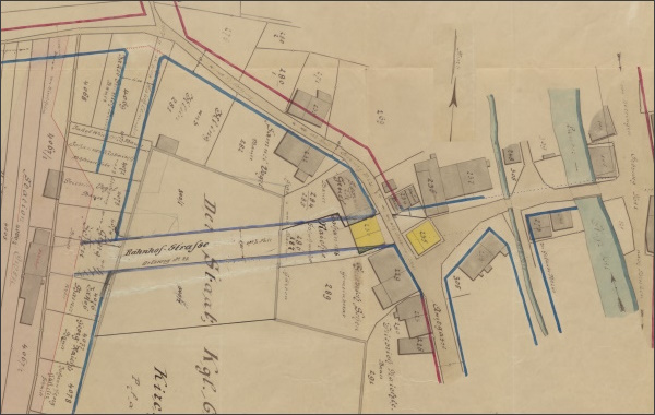 Dafür mussten das Gebäude Nr. 235 (siehe Lageplan auf der Tafel) und das ihm schräg gegenüberliegende Gebäude Nr. 230 weichen, wodurch ein kleiner Platz an der Kreuzung zwischen der neuen Bahnhofstraße, der Brühlstraße (früher Maiergässle) und der Amtstraße (früher Amtgasse) entstand.
