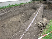 Grabung des Landesdenkmalamtesan der Mauer zum Kindergarten 2008 hinter dem Schlößlespfarrhaus. Funde: Eisenschlacken neben einer modernen Entwässerungsleitung. Zeitstellung für die Schlacken: wohl 12. Jahrhundert.
